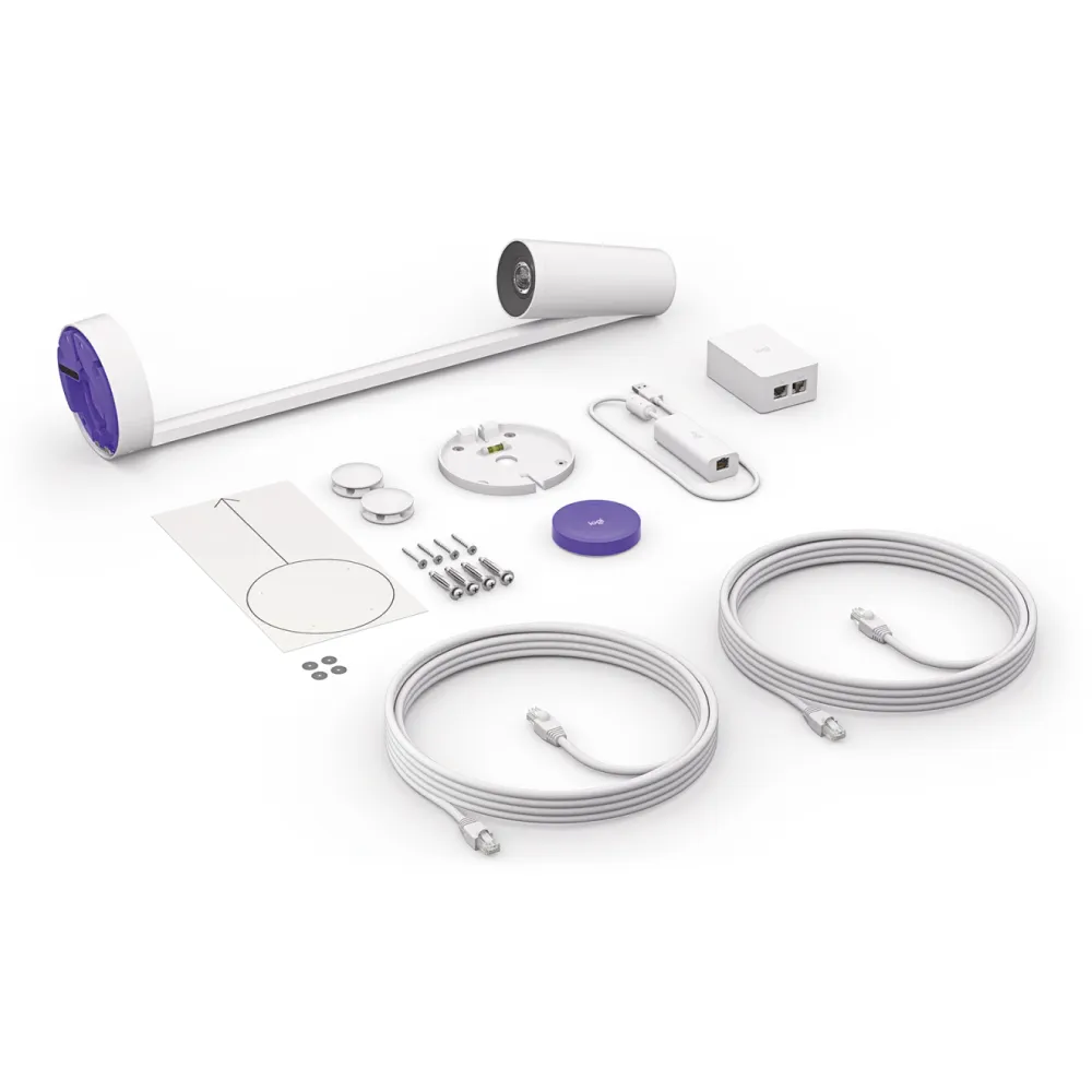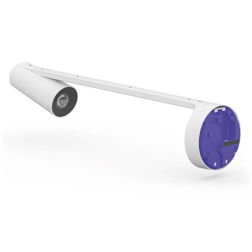 El diseño de la camara es minimalista y elegante, lo que le permite integrarse armoniosamente en cualquier sala de reuniones o aula. Su sistema de montaje en pared es seguro y versatil, y el kit de instalacion incluye accesorios para una distribucion limpia del cableado, permitiendo pasar cables por arriba, por debajo o a traves de la pared.